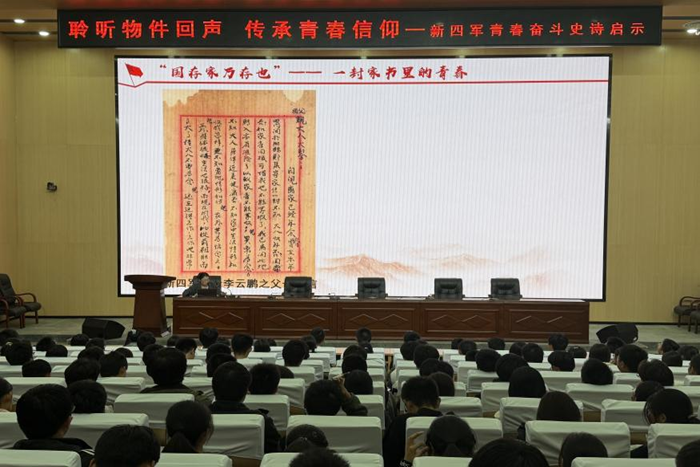 讲座从新四军战士李云鹏写给父母的一封家书开始。字迹朴实,语气平静,却蕴含着巨大的情感力量。信中,他细致地描述部队生活“粮食粗糙,不如家中饭食”,却坚定地写下“国存家乃存也”的信念。胥老师动情地剖析道,这看似矛盾的背后,是一个儿子对父母的深情牵挂,更是一名青年战士在民族危亡之际,将个人命运与国家存亡紧密相连的自觉担当。这封信成为他的绝笔,那纸页上的每一处墨渍、每一丝褶皱,都仿佛在无声诉说着青春的抉择与牺牲。
