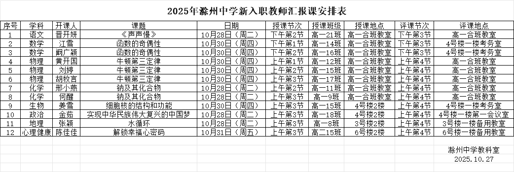 为助力新入职教师快速适应教学岗位,夯实教学基本功,提升教育教学核心能力,搭建高效的教师交流学习的优质平台,2025年10月28日至31日,滁州中学精心策划并组织开展了新入职教师公开课展示活动。本次活动覆盖语文、数学、物理、化学等多个学科,12位新入职教师依次登台授课,学校领导、各学科全体教师全程参与听评课,共同见证新秀成长。