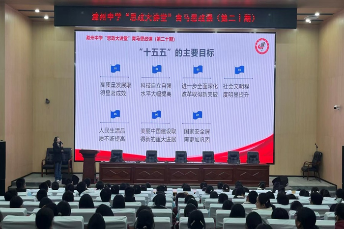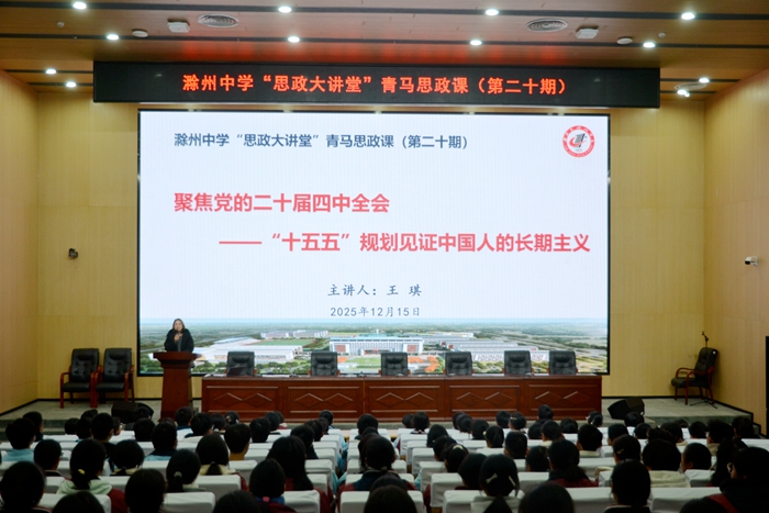 2025年12月15日下午,滁州中学 “思政大讲堂”(第二十期)之青马思政课在校报告厅顺利举行,这也是我校第40届“一二·九”科技文化节系列活动之一。本次讲座以“聚焦党的二十届四中全会——‘十五五’规划见证中国人的长期主义”为主题,由滁州中学党委委员、副校长王琪主讲,她带领高三年级的同学们深入贯彻和学习党的二十届四中全会精神,展望国家发展新征程。