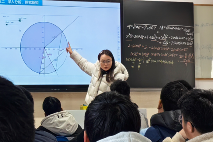 沈玉斌老师的《两角差的余弦公式》以“求非特殊角的余弦值”为问题起点,启发学生思考根据已知角求未知角。他通过类比诱导公式的推导过程,以问题串引发学生自主探究,并通过GGB动态演示,增强直观感受,突破想象空间,达到较好的教学效果。