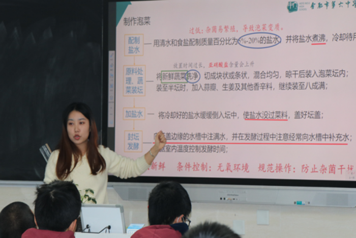 黄欣老师以生活中常见的发酵食品导入新课,通过回顾发酵知识自然引出无氧呼吸内容,实现新旧知识的有效衔接。课堂中组织学生制作泡菜,并通过学生讲解与小组合作探究等方式,引导学生理解发酵原理及乳酸菌作用和亚硝酸盐变化规律,在实践体验与交流表达中有效提升了学生的探究能力与概括能力。