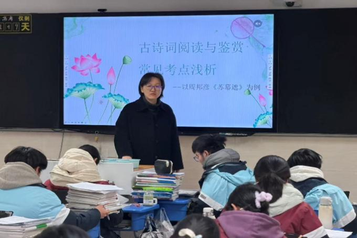 王南老师以周邦彦《苏幕遮》为例,用题目的形式,带领学生整理回顾了高考古诗词阅读与鉴赏常见考点。课堂内容丰富,选例难度适中,既重温了知识要点,又补充了教材外高考必背篇目的内容,有效助力学生古诗词阅读板块的复习。