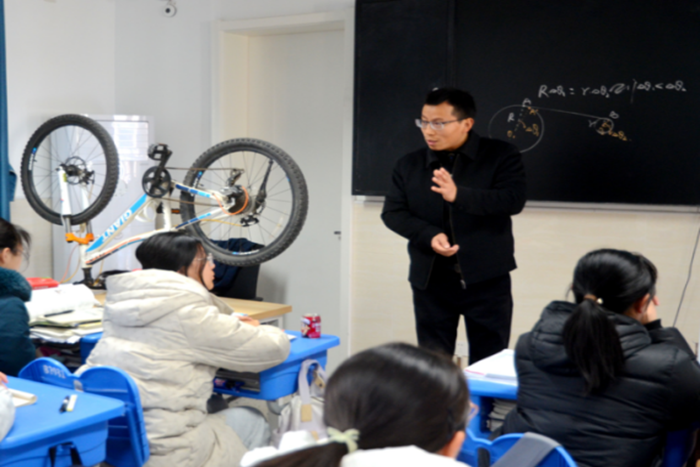 王云老师本节课创新实验形式,将自行车搬进课堂,通过观察车轮转动、齿轮啮合等现象,直观演示线速度、角速度周期等相关知识,让抽象概念贴近生活。