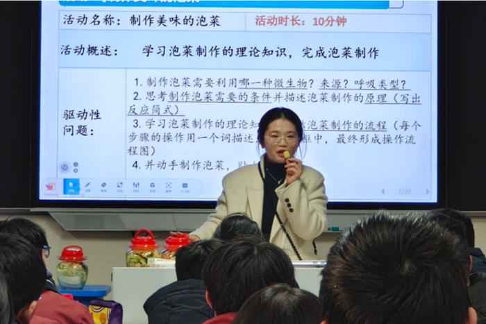 滁州中学朱长胜老师围绕元旦假期“制作发酵食品”作业展开教学,通过分析发酵原理、探讨改进措施与评价成品质量等环节,引导学生构建较完整的发酵概念体系。课堂方法多样,互动良好,整体设计更具整体性,将知识学习自然融入探究过程。