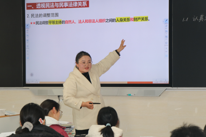 汪园秀老师以“当霸总遇上民法典”为情境主线,通过“普法活动进课堂”“霸总法务我帮忙”“德法双治辩论场”等活动串联教学内容,帮助学生理解民法的调整范围和民事法律关系的三大要素,引导学生树立尊法学法守法用法的法治观念。