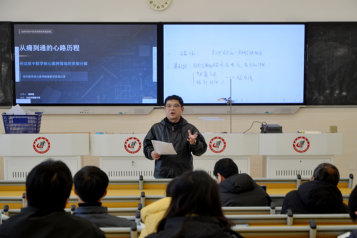 天长市炳辉中学的正高级教师胡宏强老师做了“从痛到通的心路历程——例说高中数学核心素养落地的多维分解”的精彩讲座。他就“痛点根源剖析”、“三维标签架构体系”、“高考题的核心素养诊断实例”等多个维度给大家分享自己的研究成果,获得了与会老师的高度认可。