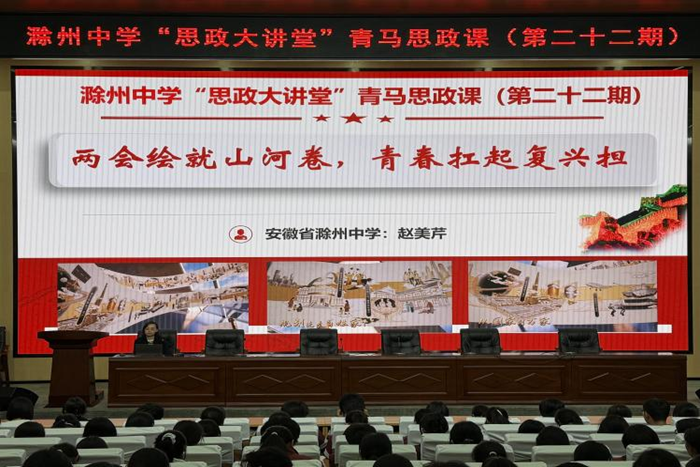 为引导青年学生了解国家发展成就,读懂国家发展蓝图,增强责任意识与使命担当,4月13日下午,在校团委的精心组织下,我校思政大讲堂系列讲座之“两会绘就山河卷 青春扛起复兴担”在热烈氛围中开讲。本次讲座是由高二年级政治教研组赵美芹老师担任主讲,来自高二年级的同学们齐聚一堂,共同聆听这堂主题鲜明、内容充实的思政课。