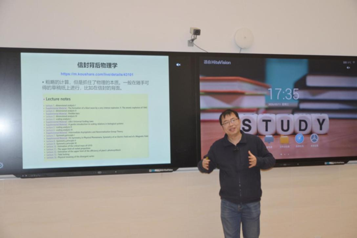 座谈结束后,两位教授在报告厅举行专题讲座,携手为全校学子送上了一场兼具思想深度与学术魅力的知识盛宴。讲座中,詹其文教授结合自身在光学领域的深耕历程,深入浅出地介绍了光学学科的发展脉络与未来前景,分享了自己在科研道路上的探索与坚守,勉励同学们始终保持对科学的敬畏与热爱,勇于探索、敢于创新。吴从军教授则以“基于热力学估算农作物产量上限”为切入点,结合自身研究成果,生动诠释了热力学原理在农业领域的实际应用,展现了物理学科服务现实、推动发展的独特价值,引导学子们以科学思维认识世界、解决问题。